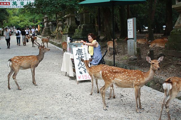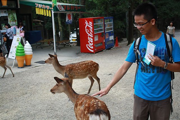 我們一路搭到春日大社前面下車,奈良這一帶就是個大公園,一下車就看到一隻公鹿在公園柵欄內看著我們,大概男生天性就是喜歡逗弄動物,老吳簡直快要樂瘋了,一路走向春日大社的途中,所有的鹿都在大路上亂走,一旁也有賣鹿餅的攤販,讓遊客可以餵食他們,這裡的鹿就跟壽山的猴子一樣,被寵壞到會去搶遊客的背包,我親眼看到一個女生被鹿包圍到叫救命的場合,所以我完全不敢有餵食的想法,餵鹿一點都沒有想像中浪漫...