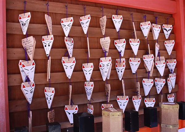(伏見稻荷神社特有的狐狸「繪馬」也就是日本神社中的木頭許願牌,仔細看看每張狐狸臉,大家都好有創意~)