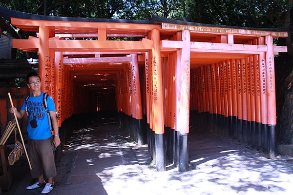 仔細看這些鳥居,每一座大小尺寸各異,而且上面都刻有個人或是公司行號的名字,原來這些都是信徒供奉祈福所設置的,日積月累就形成了這環繞山頭的千鳥居,真是相當壯觀,走到半途我們看到一張說明供奉鳥居的料金表,這可激起了老吳的鬥志,他說等他以後賺錢也來設一個大鳥居放在山頭,怪神氣一把的。(作者云:且讓我們期待那天的來臨!)