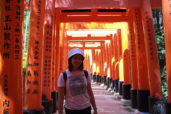 這裡舉目所望都是狐狸神的造像,而且神態各異,有咬稻穗的、咬錢的、高高在上的、看起來很淘氣、也有看起來很放空的…沿路走沿路看,真的很有趣,沿著朱紅色的千鳥居走廊一路往上走,因為有樹蔭,總算讓我們在炎夏下享受到一點點清涼。