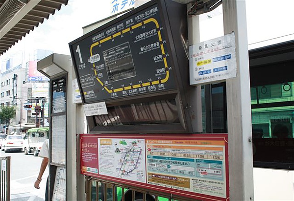 在弄懂交通方式之後,我們還索取了奈良的觀光交通手冊,上面連公車搭乘方法都有說明,相當仔細,接著我們就到車站前去等公車,奈良的公車價格是一趟是200元,比京都便宜20元,而我們到訪的那天適逢周六,所以車上遊客也不少。題外話,雖然這趟旅程相當充實,不過我卻在奈良公車上掉了我的零錢包,損失一張高捷卡和八百多元日幣,沒有甚麼大損失,真是萬幸。