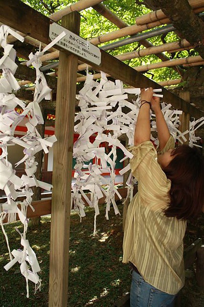 (這是春日大社有名的紫藤花,不過夏天當然沒有花可以賞,花架下綁滿了信徒許願的紙條,看這位媽媽相當認真的要綁在最高的地方,這樣會比較靈驗嗎?)