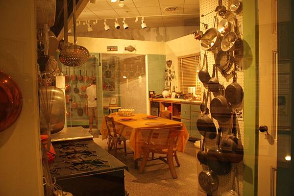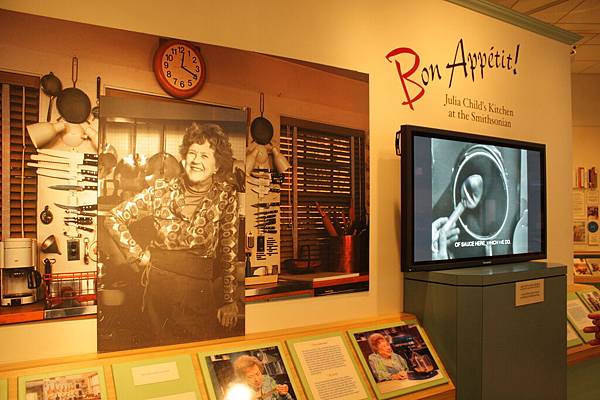第二站我來到 National Museum of American History,在門口等到十點開門,跟著人群通過安檢後,我就從一樓一路往上逛,顧名思義,這座博物館展出的是美國的建國歷史和生活史,所以在當中可以 看到她們生活型態的演進,還有一些歷史文物,像是第一面國旗或是黑人奴隸、南北戰爭之類的文物。在這裡我比較有興趣的是一樓的角落裡,展出美國一位很重要 的電視女廚師的生平,也是電影《美味關係》中由梅莉史翠普飾演的角色Julia Child,她將法國廚藝的特色化作家常菜,是美國60年代家喻戶曉的人物,相當於台灣早期傅培梅大師的地位,博物館裡重現了她的廚房和相關擺設,以及她的影片和書籍,我因為看過電影的關係,對於能在這裡看到這項展出,感到相當興奮,在這裡駐足了好久。