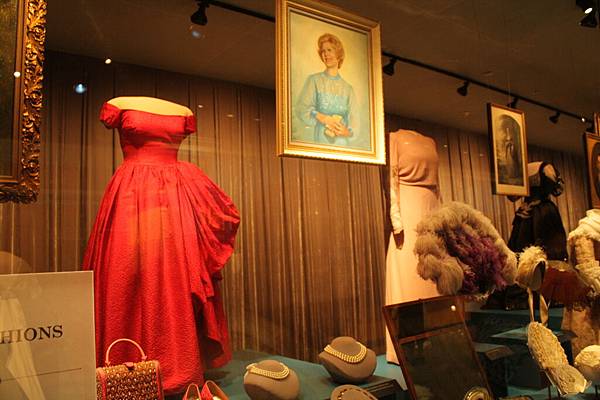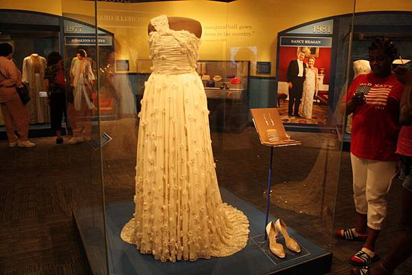 在這個博物館內,另外還有幾個亮點,像是第一夫人館,這裡展出歷屆第一夫人穿過的禮服,就連歐巴馬夫人蜜雪兒那套台灣之光也在這裡展出,每位第一夫 人的裝束也跟著時代和愛好有不同的特色,不過我發現大家看得最久的還是賈桂琳的服裝,不停的有女士讚嘆說:「她真的好美啊!」,再根據之後幾天造訪的幾個 行程,不難看出美國人對甘迺迪夫婦的懷念和喜愛。