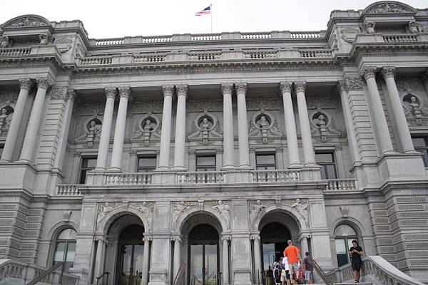 看完國會山莊,我又是一路上坡往後頭的國會圖書館走,這裡要看的是Jefferson Building,這也是國會圖書館中年代最久的一間圖書館,大家都是衝著它裡面壁畫與古典的裝潢而來。而要進去這裡也得通過安檢,這裡的安檢大概是這一區裡最嚴格的,一切比照機場辦理,男生連皮帶都要脫下來,有人拿相機拍安檢過程還被制止,進到美國後遇到最多次的要求應該就是安檢,不管到那裏都有保全人員要求檢查包包,連看百老匯都一樣,這個泱泱大國為了防堵攻擊事件,只能說是非常小心謹慎。