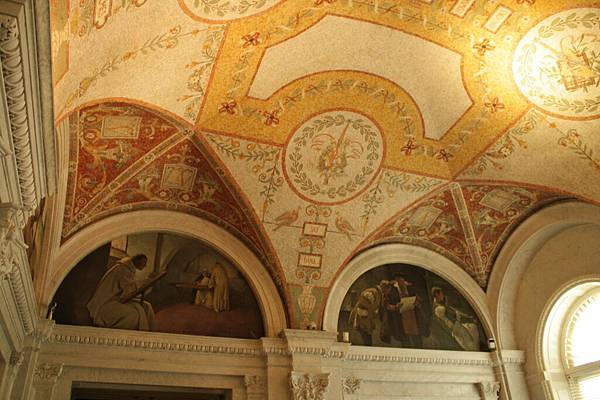 國會圖書館裡有非常漂亮的壁畫,可以隨時加入一旁的導覽員解說,他會解釋這些壁畫是代表甚麼意思,也可以從二樓參觀閱覽室大廳,往下看非常壯觀,不過不能拍照;另外還可以看到古騰堡的印刷聖經等文物,不過這些景點對老美來說,也算是很熱門的觀光地點,所以到這裡來要有面臨人潮很多的心理準備。