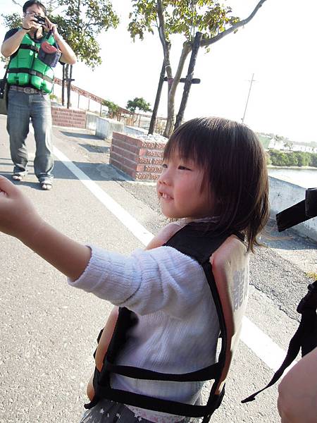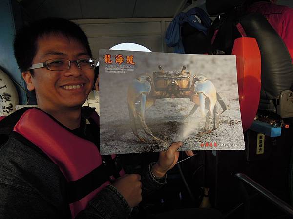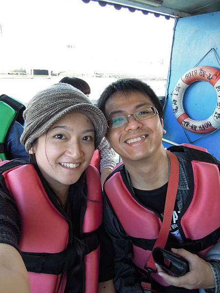 等到三點半,我們的航班同時也是當天的最後一班次準備出發,店家廣播請大家穿好救生衣準備上船,廣播的時候還不忘提醒「65公斤以上穿綠色,以下請穿紅色」,哈哈...大家真是一陣尷尬,手忙腳亂穿完救生衣,我們往小碼頭出發,導覽員很嗨的叫我們跟台灣本島暫時說掰掰,開始今天的潟湖之旅~