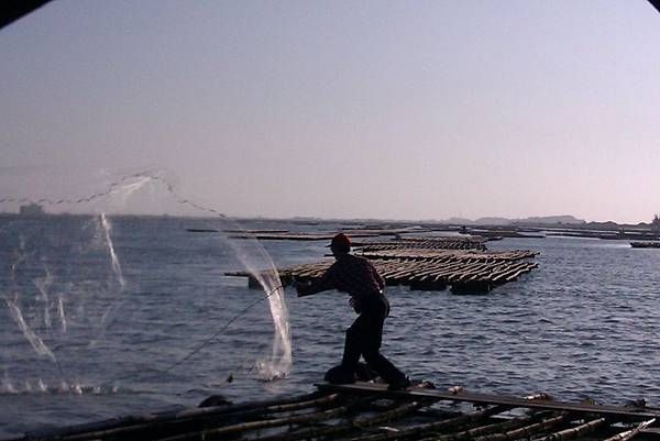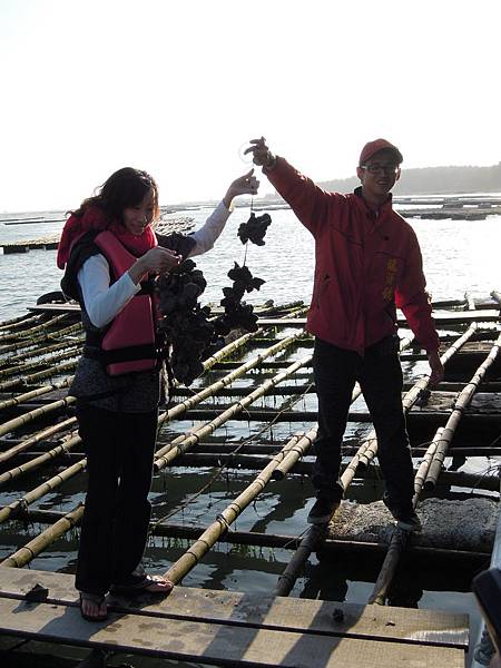 本來以為大概只有轉一圈就回來了,沒想到船在蚵架前停下來,導覽員先是走上蚵架,示範把成串的蚵仔拿起來給旅客欣賞,也徵求一兩名旅客「下海」一起體驗,看完蚵仔,連船長也下海了,看起來酷酷不多話的船長,原來才是最會講話的,妙語如珠的成人笑點(我是說只有大人才聽得懂,不要想歪),逗得大家哈哈大笑,船長下海幹嘛呢?他要示範他很「低調」的牽罟(ㄍㄨˇ)功夫,還應觀眾要求示範了好幾次,真是好個低調的船長......(船長云:我穿皮鞋就能走蚵架,有必要說給人家聽嗎?我會灑出心型網,這也要說給人家聽嗎?)