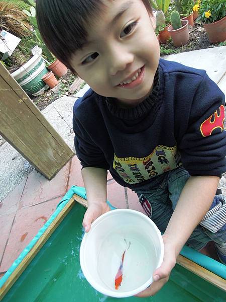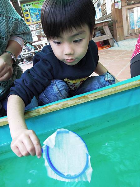 (這小孩實在太聰明了,一下子就把手邊所有網子弄破,網子撈不起來,就直接拿碗撈....這當然是犯規啦,所以後來被媽媽勒令放回去了XD)