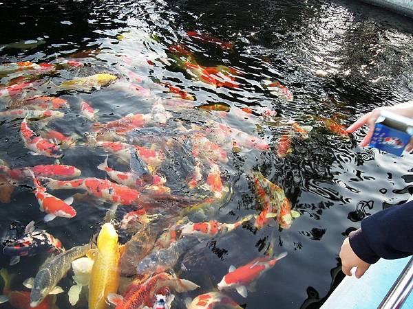 (比手臂還粗的錦鯉們,而且很現實,沒有飼料是不會靠過來的)