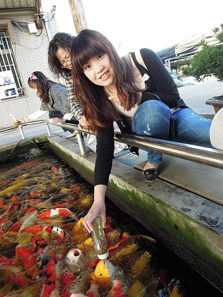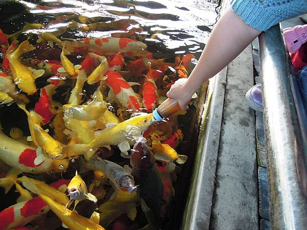沒想到這裡小小的,可是卻有很多小朋友應該會玩瘋的活動可以玩,本來是要來釣青蛙,可是老闆說釣青蛙夏天才有,所以一團人就先跑去錦鯉池餵魚喝ㄋㄟㄋㄟ,說穿了就是把飼料泡水裝在奶瓶理,近距離的餵滿池的錦鯉們,看著魚很努力的搶奶嘴,就連我都玩瘋了!