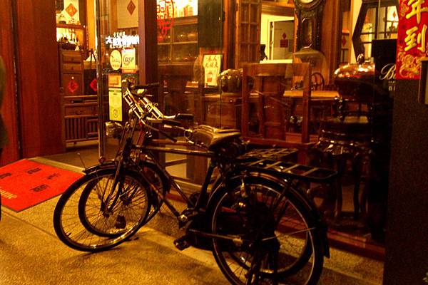 (餐廳門口,連腳踏車都是阿公年代的,就是後面有可以放東西的大大後座,整間餐廳在黃光下照拂下,非常古色古香)