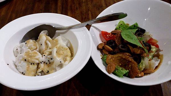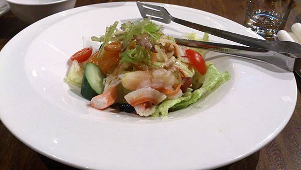 第一道沙拉,蔬菜拌著干貝唇、生魚片和蟹管肉,醬汁走和風路線,味道清爽用料新鮮,但吃到後來醬汁略感稍鹹。