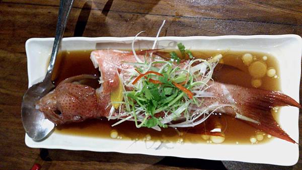米粉還沒吃完,這條完整的蒸紅魚就上桌了,我們笑說完了完了,已經開始飽了,後面再上菜我們會不會吃到崩潰,結果服務生聽到我們說話,連忙過來問怎麼回事,聽完之後,服務生也很妙的回答了一句:「喔,後面還有兩三道喔,你們可能會更崩潰...」真是幽默的服務生~