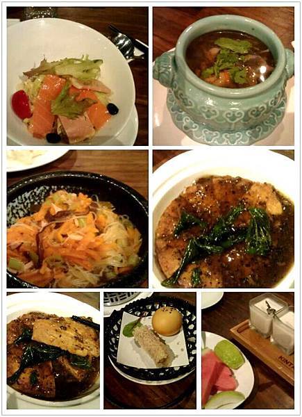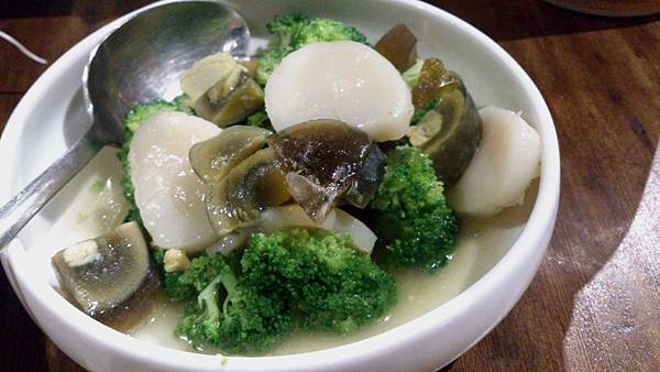 這是老吳的素食菜式,餐點數跟我們一樣,我記得的有沙拉、素羹湯、金瓜米粉、猴頭菇、百合炒花椰、炸山藥捲等,老吳說這裡的素食餐點也有一定的水準,若是有跟吃素的朋友一起用餐,到這裡來也不用擔憂沒有東西可以吃(就算吃純素的人也可以請服務生轉告主廚特別安排~)