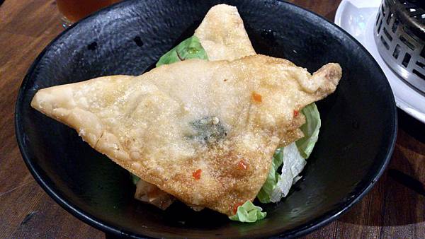 最後上的是這兩道,花椰菜炒干貝和皮蛋,還有炸餛飩皮包花枝漿,花椰菜清爽,但吃起來比較沒有甚麼記憶點,而這道有點像蝦餅的炸物,淋上泰式的酸甜醬汁,裡面花枝漿還加上九層塔提味,吃起來味道介於鹹酥雞和泰式蝦餅之間,是個有創意的嘗試,不過放在最後一道上菜,總覺得油膩了些。