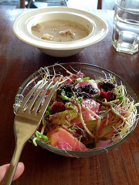 上菜的速度非常的快,一下子飲料沙拉濃湯就紛紛上桌了,沙拉搭配油醋和優格二選一,當日我們選擇優格口味;老吳則是點三明治加套餐,也是230元,老吳選的是濃湯,濃湯對我們來說有點淡,不過沙拉挺好吃的,份量也不少。一開始我們還想說為什麼不像其他店,套餐同時提供濃湯和沙拉,一定要二選一,上桌後,我覺得如果是這樣分量的話,那就讓人蠻能接受的。