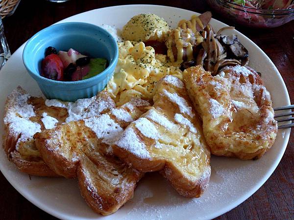 主餐接連上桌,我的法式丹麥吐司選擇淋上楓糖糖漿還有糖粉,簡直就是肥胖到不行的極品!套句老吳說的「好油、好香、好胖...可是好好吃!」反正他老是跟我說,早餐吃飽一點沒差,所以我非常遵從這位中醫師的話照吃不誤。丹麥吐司再用法式吐司的煎法,我本來想吃兩塊大概就會油膩膩的了,結果不會!只能說油得恰到好處!(誤),不知道店家上桌前有沒有先吸過過多的油,或是油溫很夠的關係。