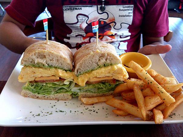 老吳的拖鞋麵包起司三明治份量也不少,我光看他要把三明治塞到嘴巴裡,下巴快脫臼的樣子我就快笑死了,總之他吃得心滿意足的,還刻意把附餐的薯條留到最後吃(一樣是好油好香好胖可是好好吃!)看來他們家的三明治也很值得推薦~