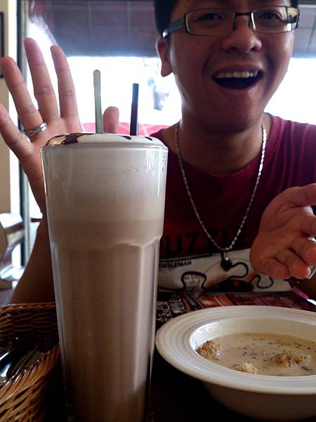 最後的附餐飲料我點了熱伯爵,不過我覺得老吳的飲料更有趣些,他點了摩卡鮮奶茶,鮮奶茶裡還加上微苦的摩卡粉,加上厚厚的奶泡,不會太甜又很大一杯,大熱天裡挺消暑~