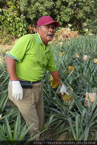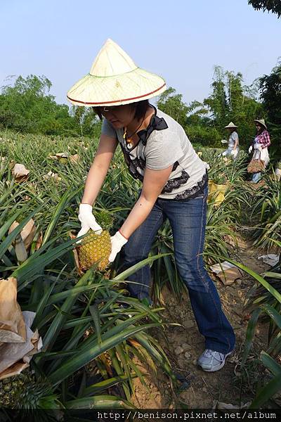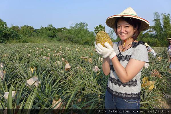 今天的最後一個行程是要直接到當地的鳳梨田裡體驗採果樂,別看鳳梨田裡的鳳梨欉矮矮的,來到這邊要先戴上斗笠防曬傷、戴上手套防受傷、穿上帆布圍裙防割傷,慎重其事的準備好裝備後,才能跟著農夫下田摘鳳梨,這裡的鳳梨叫做西瓜鳳梨,不是因為吃起來有西瓜味,而是這種鳳梨體型比較圓胖,就跟鳳梨一樣,跟著阿伯的指示,最好摘採表皮已經泛黃的鳳梨,甜度最是剛好,如果你不知道怎麼挑,就請工作人員幫忙,保證挑到又大又漂亮的鳳梨,而且鳳梨頭還可以摘下來種小盆栽,當作居家小擺設~