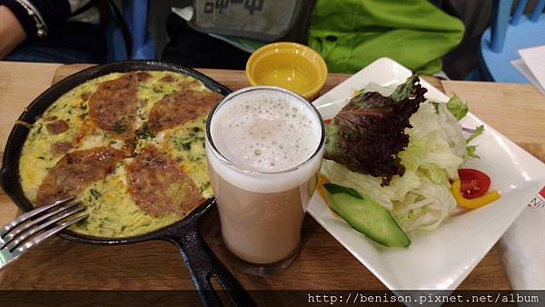 因為餐廳橫跨三棟透天店面,所以室內相當寬敞,加上大片落地窗採光,設計也很明亮,座位將近40多個,很適合三五好友或是一家大小來此小聚,店內主要販售全日早午餐,中晚餐時段則另有義大利麵、燉飯、鬆餅等選擇,除了附餐飲料外,還可以選擇加價搭配Twinings的茶。早午餐一開始便會附上烤得熱熱的麵包,搭配店內看老闆心情每天特製的抹醬,熱呼呼的先滿足客人的胃。餐點內容比較少見的是西班牙烘蛋系列,有嫩雞、義式臘腸、培根和海鮮蛤蠣四種口味,烘蛋的烤盤內容非常札實,除了主要食材,還有滿滿的馬鈴薯,就連我弟這個170幾公分的大男人當作早餐吃都蠻有飽足感。