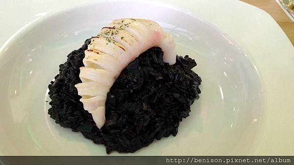 (店內招牌之一的墨魚燉飯!總算記得把照片放上來了....黑黑一團燉飯裡面用料超豐富,滋味很鮮美,上頭的墨魚水煮後烘烤得剛剛好,一點都不韌喔)