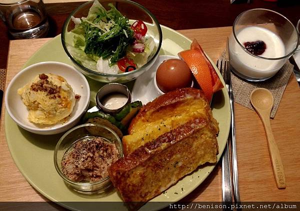 雖然等了一下子,幸好小蘇蘇餐點讓人驚豔,清爽自然地擺盤風格,滿滿的餐點排列在大木盤上,配色鮮明讓人食指大動,我點的澎啾香榭蛋吐司,除了油油香香的法式吐司之外,還有清爽不膩的鮪魚拌洋蔥塔,外加手工優格搭果醬、沙拉碗、水果、和水煮蛋,再一球札實的馬鈴薯,一大盤對我來說吃完非常飽足。