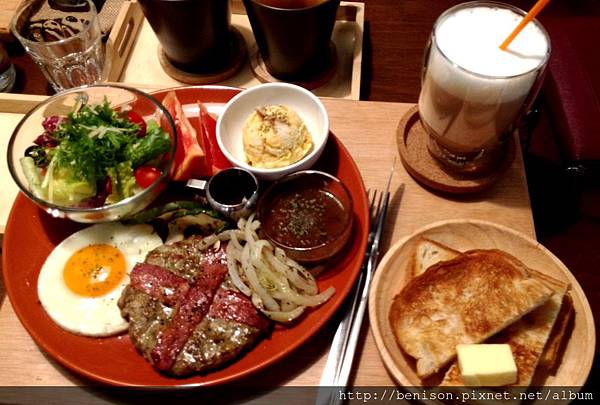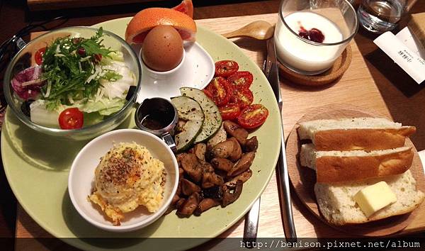 吃素的老吳和吳媽(也就是我婆婆啦)點的是草食系素人早餐,也是厚厚一大盤,除了主食麵包不同之外,其他的配菜都差不多,並多了炒磨菇,老吳說男生吃起來分量還好,媽媽則是飽到最後一刻,吃完的感想一樣是豐富卻清爽。